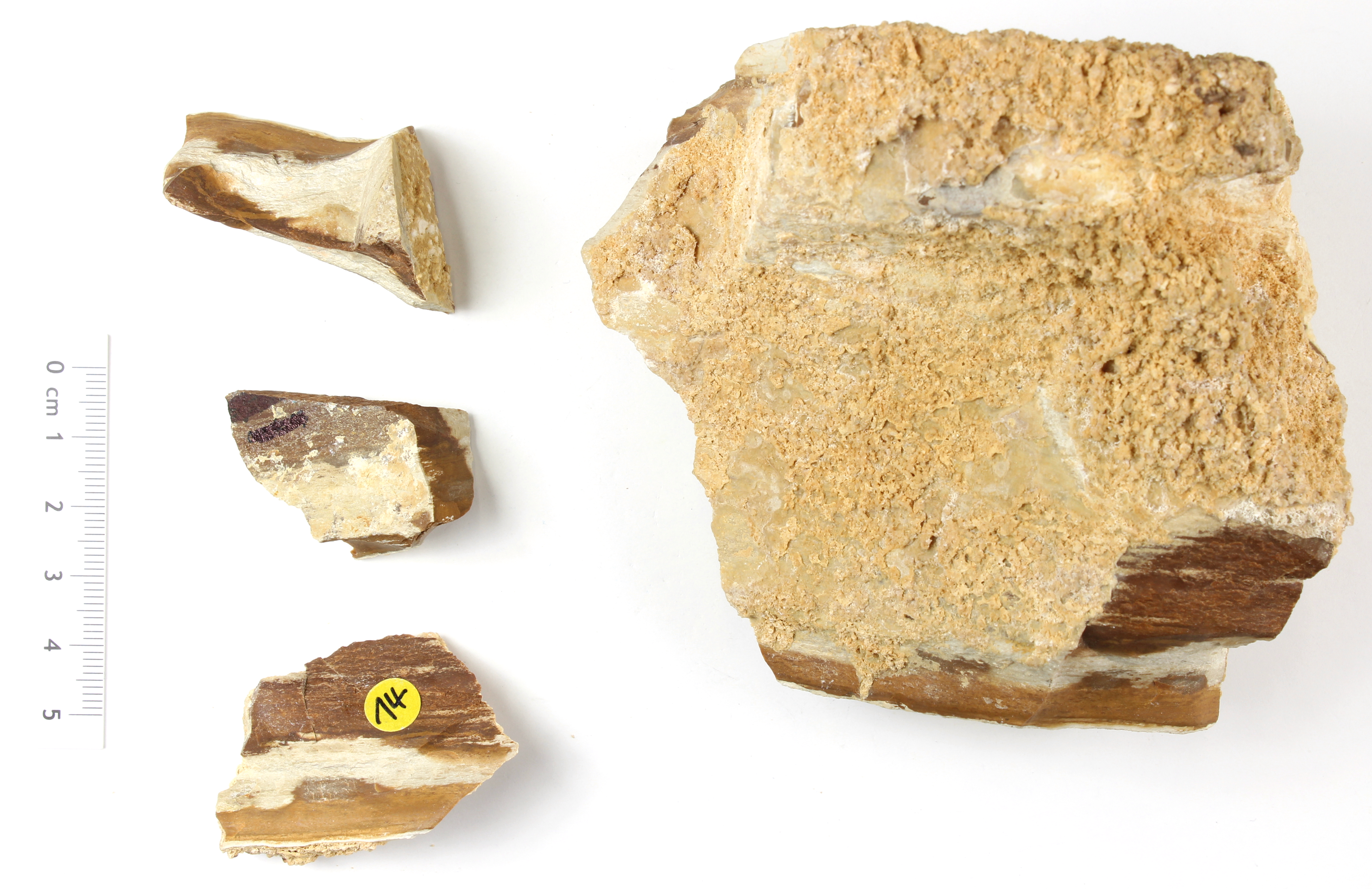 feinkörniger Hornsteinfladen mit Schlieren und dünner Rinde; versintert