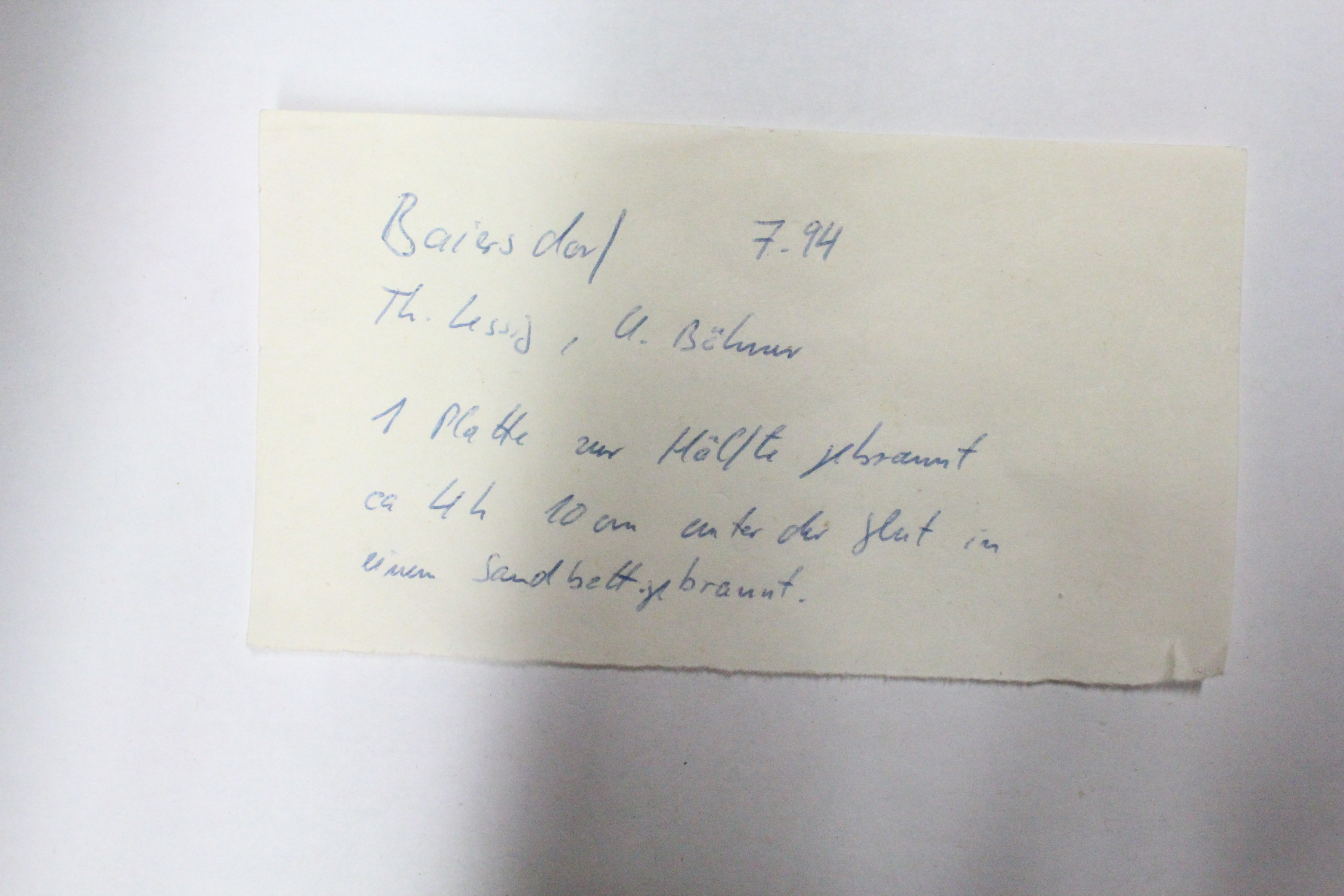 In ursprünglicher Datenbank nicht vorhanden. Dem entsprechenden Schächtelchen im Lithotheks-Schrank liegt ein Zettel bei mit der Auffschrift: "Baiersdorf 7.97. Th. Lessig, U. Böhner. 1 Platte zur Hälfte gebrannt; ca. 4 h 10 cm unter der Glut in einem Sandbett gebrannt."