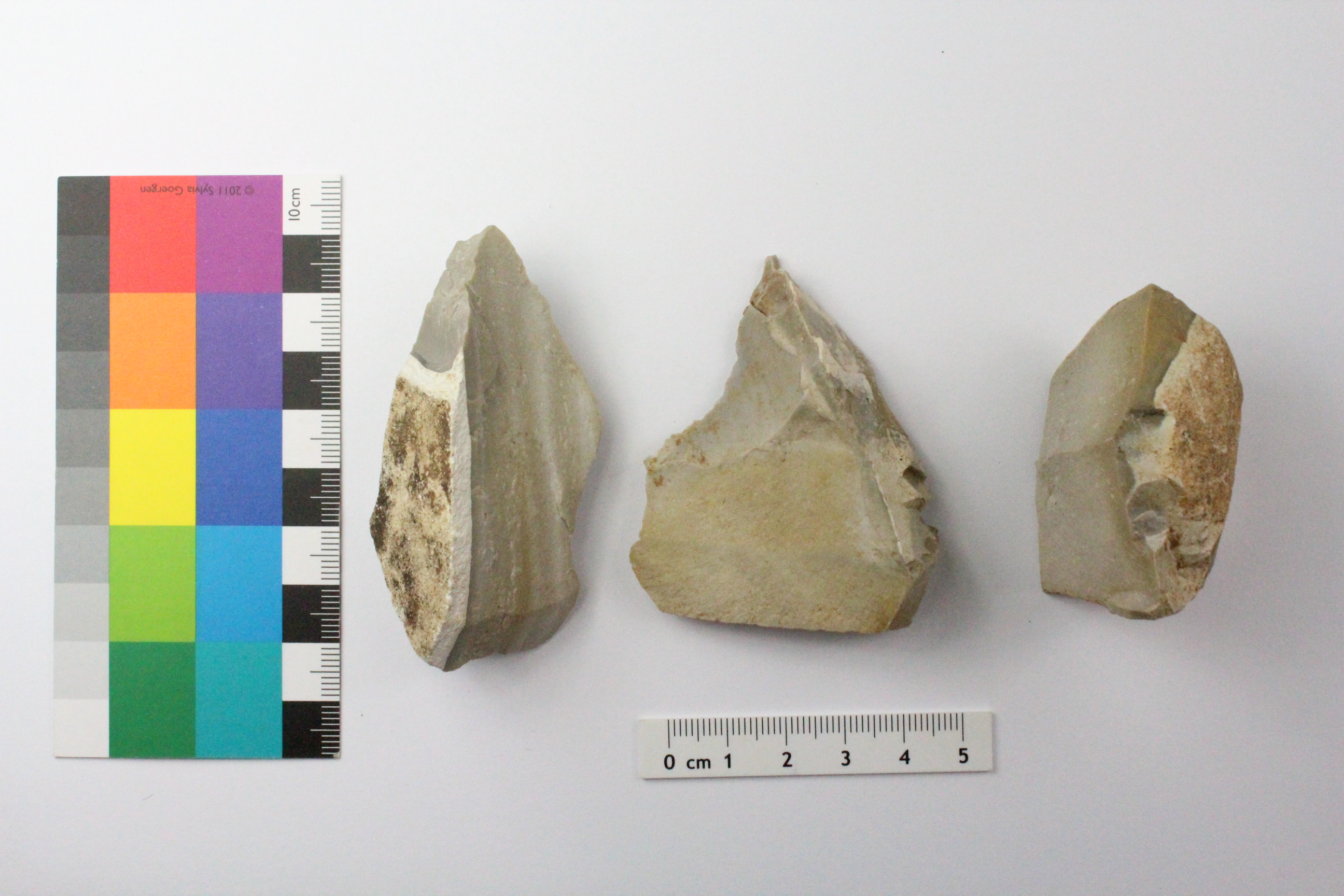 - weiße Patina mit einer Färbung zwischen 2.5Y 8/2 (weiß) und 5Y 8/2 (weiß), teilweise auch dunklere Partien mit 5Y 6/1 (grau)